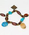 Tiny brass rings, handcrafted wooden and glass beads in shades of brown and blue. Free size stretch bracelet.