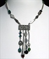 Bits of metal and glass beads artistically strung on a pale green cord. Hints of red, green & turquoise glass beads. Very bohemian and trendy.
