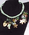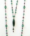 Two strand necklace, highlighted by a beautiful long glass bead drop. Stunning combination of green and lilac. The drop sits closer to the neck.